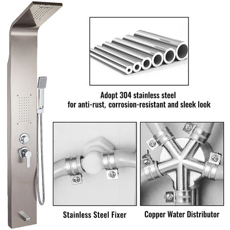 - 【ROBUSTA STRUTTURA IN ACCIAIO INOX】- Colore: Argento; Il pannello ispessito in acciaio inossidabile 304, i connettori in ottone e i tubi flessibili antideflagranti rendono questo pannello doccia argento resistente alle alte temperature. Il design integrale lo rende a prova di perdite e garantisce una qualità eccellente. L’elegante superficie spazzolata è antiruggine, a prova di dito e facile da pulire.