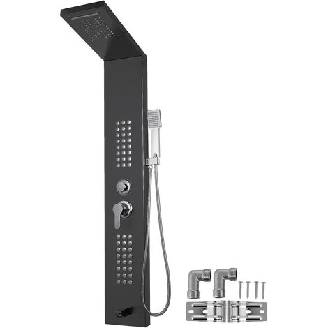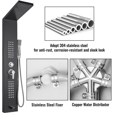 - 【ROBUSTA STRUTTURA IN ACCIAIO INOX】 – Colore: Nero; Artigianato: lucidatura; Il pannello ispessito in acciaio inossidabile 304, i connettori in ottone e i tubi flessibili antideflagranti rendono questo pannello doccia nero resistente alle alte temperature ea prova di perdite per garantire una qualità eccellente. La superficie classica è antiruggine, a prova di dito e facile da pulire.