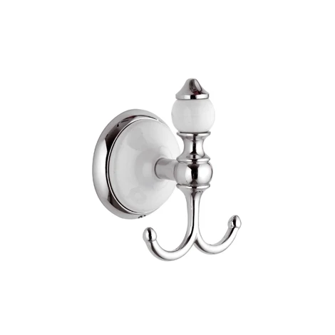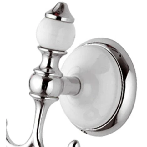 Porta abiti dotato di doppio gancio, realizzato ottone cromato con inserti in ceramica bianca. L’installazione è prevista a parete tramite viti e tasselli compresi nella scatola. Dal punto di vista tecnico è largo 80 mm, alto 105 mm e la rosetta coprimuro ha un diametro di 65 mm. La serie Epoca presenta un design semplice e stondato che la colloca perfettamente negli ambienti classici e retrò. Negli anni Remer si è affermata nel mercato internazionale diventando un punto di riferimento nel settore, porta bandiera dell’alta qualità in tutto il mondo.Tipologia : Porta abito