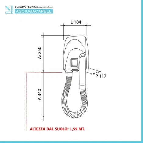 Riepilogo caratteristiche tecniche asciugacapelli a parete con tubo flessibile e presa rasoio a 3 velocità