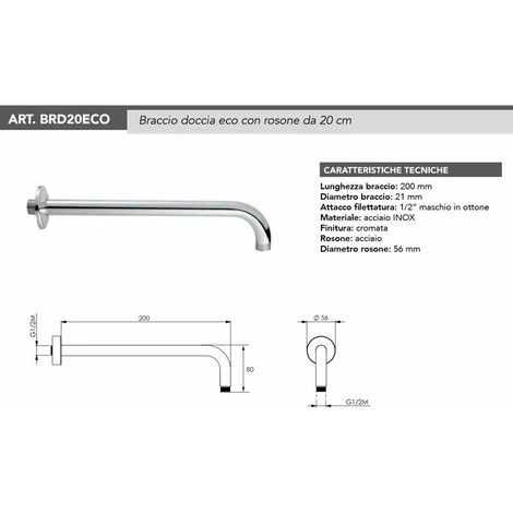 Braccio doccia in acciaio inox ideale per essere installato in ambienti doccia di piccole dimensioni grazie alla sua lunghezza da 20 cm potrai abbinare un soffione doccia dallo stile tondo minimale per rendere il tuo ambiente bagno moderno e contemporaneo, realizzato in Italia con materiali di alta qualità, acciaio inox con finitura cromo lucido