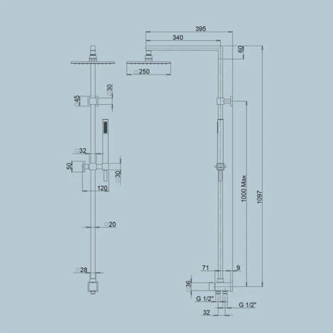 Colonna doccia saliscendi in acciaio inox e con deviatore in ottone cromato; soffione ultraslim 25×25 cm