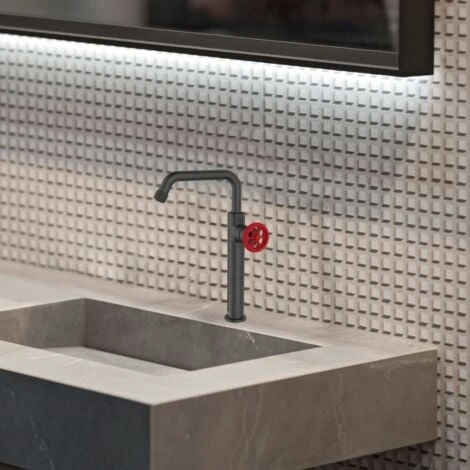 Stile industriale nel vostro bagno con il miscelatore per lavabo Indus nero in versione bocca alta e maniglia rossa. Facile da installare con il suo sistema Essefix (easy fixing) è facile da montare e da progettare con il suo scarico abbinato.