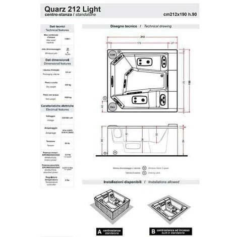 Con le sue dimensioni di 212x190xH90 cm, la minipiscina idromassaggio Quarz Light 212 pu? essere posizionata ad incassoo in appoggio.