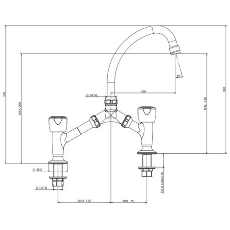 Miscelatore a ponte, 2 fori, per lavabo, interasse 120 a 240cm