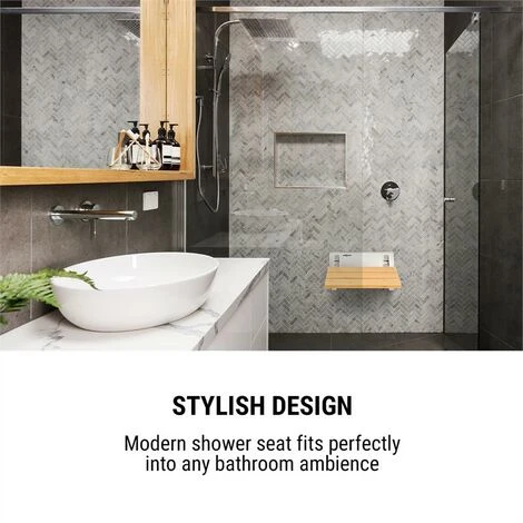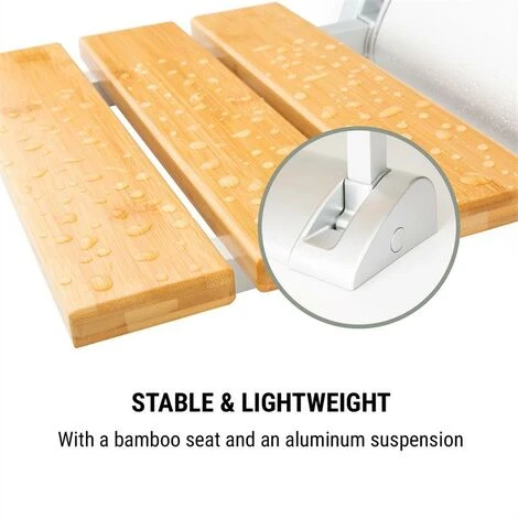 La sedia da doccia dispone di una comoda seduta di bambù e dopo l’uso si può ripiegare in modo salvaspazio. Grazie a un leggero gancio appendisedia d’alluminio, non convince soltanto con un design moderno ed elegante, ma si installa velocemente grazie al set di montaggio incluso. Nonostante il suo peso ridotto, è particolarmente stabile e sopporta un peso fino a 160 kg.