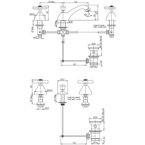 Paini Liberty Rubinetto Bidet e Lavabo set completo bagno batteria 3 fori con maniglie a Croce stile classico e retrò manopole a stella Cromato Made in Italy
