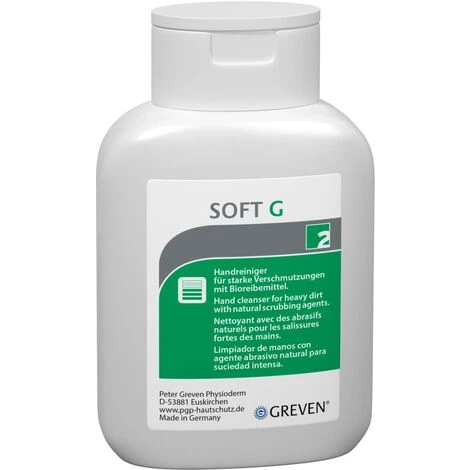 DescrizioneEsecuzione:GREVEN® SOFT G. Detergente per le mani sotto forma di pasta contenente farina di nocciolo d’oliva (esfoliante biologico), per lo sporco intenso. Rischi: grassi, oli, polvere di metallo, grafite o fuliggine. Caratteristiche: pasta, priva di solventi, seborestitutiva, pH neutro.Dati tecnici Serie GREVEN® Confezione Flacone / tubo Grado di sporcizia Sporco intenso Tipo di prodotto Pulizia della pelle Codice articolo 095614 250 EAN / GTIN 4260029179460 Codice del produttore 14124002