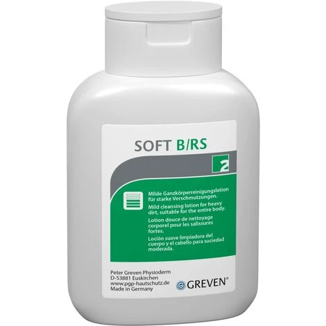 DescrizioneEsecuzione:GREVEN® SOFT B/RS. Lozione detergente per la pelle a elevato potere pulente, contro lo sporco da medio a intenso. Caratteristiche: lozione, combinazione di tensioattivi efficaci ma delicati, pH neutro, priva di esfolianti, solventi e saponi, seborestitutiva, profumata.Dati tecnici Serie GREVEN® Confezione Flacone / tubo Grado di sporcizia Sporco intenso Tipo di prodotto Pulizia della pelle Codice articolo 095602 250 EAN / GTIN 4260029177817 Codice del produttore 14107002