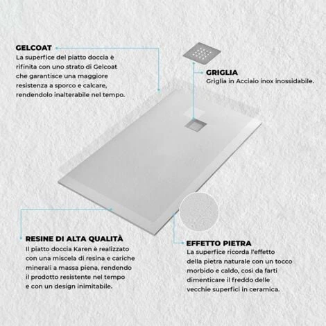 La superficie del piatto doccia oltre a distinguersi per un piacevole effetto pietra caldo e morbido, viene rivestita con uno strato di Gelcoat che garantisce una maggiore resistenza ad agenti chimici, radiazioni UV, idrolisi, graffi e impatti.