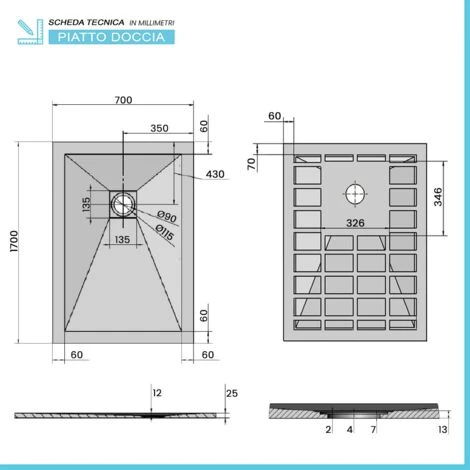 - Dimensioni del piatto doccia: 70 x 170 cm