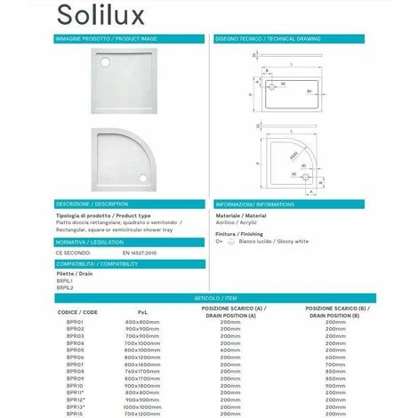 Piatto doccia rettangolare in resina da 70×90 cm impermeabile in colore bianco |Ponsi Rubinetteria SOLILUX BPR03