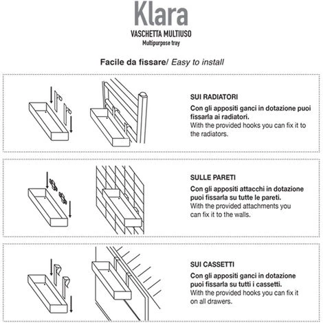 Klara è la nuovissima vaschetta portaoggetti multiuso originale e utilissima. Con gli appositi accessori in dotazione, la puoi applicare sul tuo radiatore, sui cassetti, sulle pareti e nella versione con magneti sulle superfici metalliche.