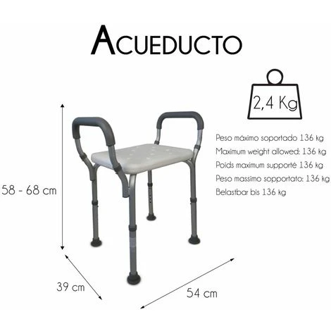 SICUREZZA ED ADATTABILIT��_Le sue gambe hanno punte in gomma antiscivolo, che garantiscono la sicurezza dell’utente. Inoltre, possono essere regolate in altezza, adattandosi alle esigenze dell’utente o dei famigliari. | LEGGEREZZA E QUALIT��_Lo sgabello per bagno ha una stuttura in alluminio e la sua seduta in PVC, rendono questa sedia doccia molto leggera (pesa solo 2,4 kg), ma anche robusta e resistente all’acqua. | SEDUTA ERGONOMICALa sua seduta ergonomica rende questo sedile per doccia molto confortevole. Ha anche dei fori che facilitano il drenaggio dell’acqua, e con i braccioli che aiuteranno l’utente a sedersi ed alzarsi comodamente | FACILE MONTAGGIOPer montare lo sgabello da docciasaranno necessari solo 5 minuti. |