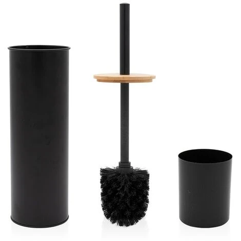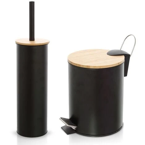 Set accessori bagno – portascopino e pattumiera linea Haiti in acciaio nero e legno di bambù naturale