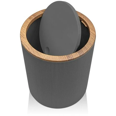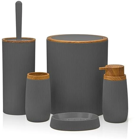 Set accessori bagno Blob in plastica liscia dalla finitura grigia con dettagli effetto legno completo di dispenser sapone liquido, portaspazzolino, portasapone, porta scopino bagno e cestino gettacarte