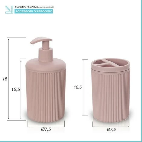 - Set composto da dispenser sapone, portaspazzolini, portasapone, portascopino e pattumiera;