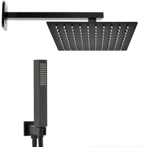 Set doccia quadrato nero opaco – completo di soffione 25×25 cm, braccio da 33 cm e doccetta con presa acqua e flessibile