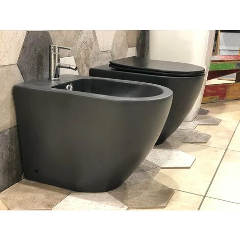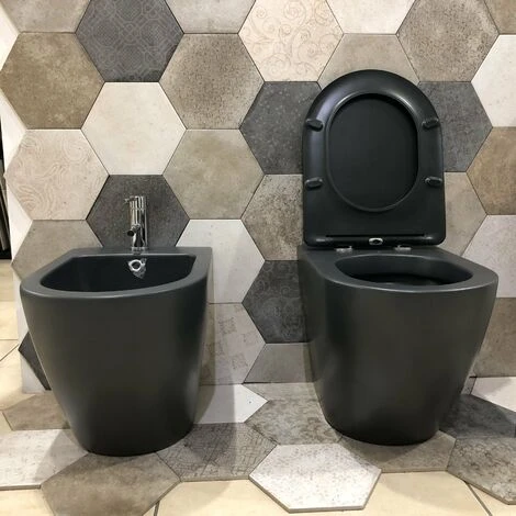 Bellissima coppia di Sanitari a Terra in versione tonda colore nero opaco esterno ed interno. Bella, elegante e moderna rappresenta il fiore all’occhiello della nostra gamma di sanitari.