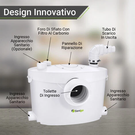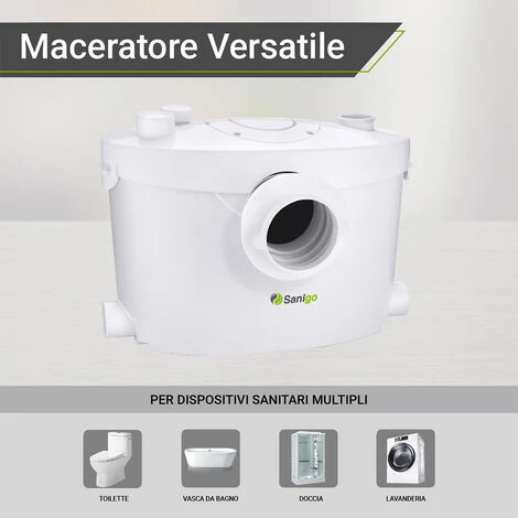 - La pompa trituratore sanitario multifunzionale funziona in modo completamente automatico al risciacquo. Viene fornito con un’uscita e 3 ingressi sanitari per il WC, la vasca da bagno, la doccia, il lavandino della cucina e altro.