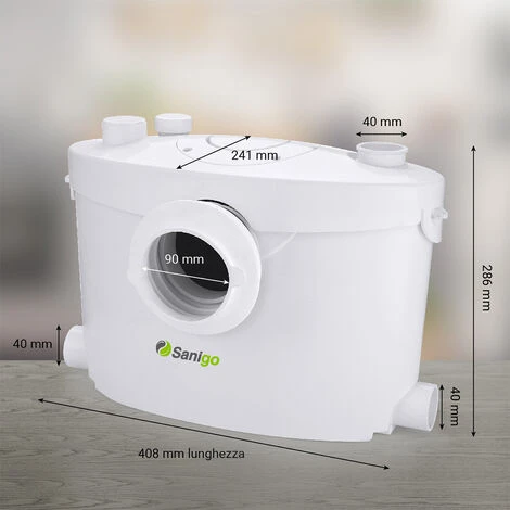 Pompa trituratore sanitario Sanigo SANI400+ che elimina le acque reflue dai sanitari e le scarica nella linea idraulica principale. È progettata con 3 ingressi che si collegano a più dispositivi sanitari come WC, doccia, vasca da bagno, lavello della cucina e altro.