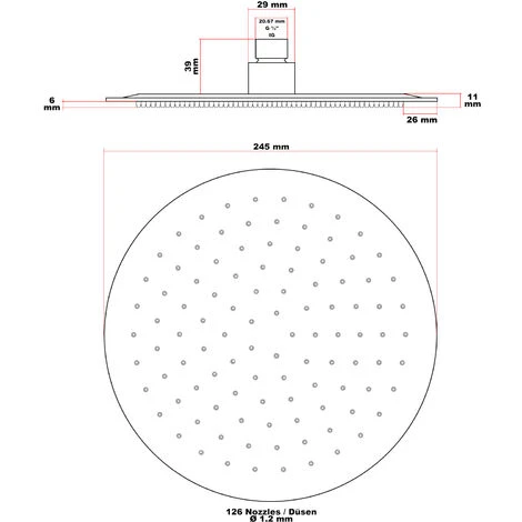 | Dimensioni | Altezza: 0,7 mm Collegamento: 20,67 mm (G 1/2) IT Diametro: 245 mm Numero di ugelli: 126 Diametro degli ugelli: 1,2 mm Dimensioni incl. attacco: 245 x 245 x 245 x 50 mm |