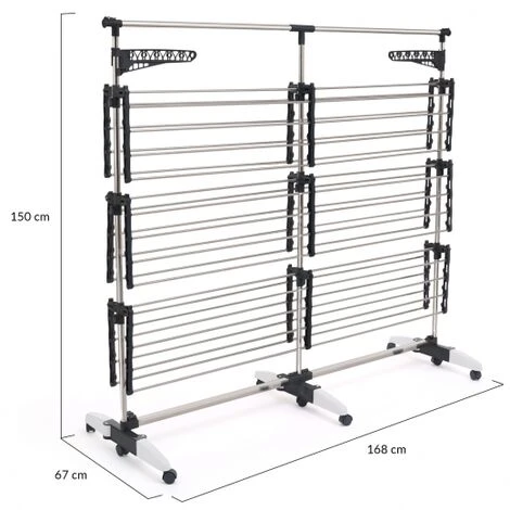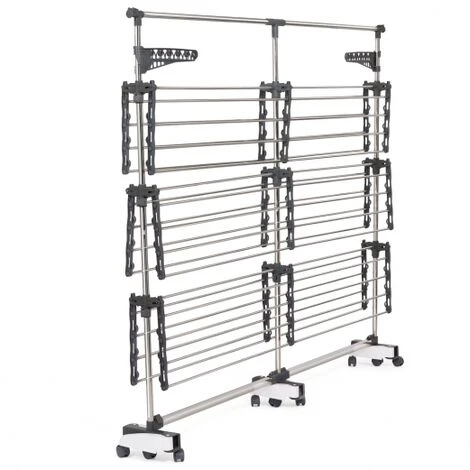 L’asciugatrice SUPRA con i suoi 50 m di spazio per stendere è l’alleato ideale per fare un bucato dopo l’altro e per stendere i vestiti di tutta la famiglia. Questo stendino di grande capacità consente di beneficiare di tutte le possibili soluzioni di asciugatura. A seconda della quantità di biancheria e delle vostre esigenze, potete regolare l’altezza dei 3 livelli di appendimento all’altezza desiderata. Utilizzate le clip integrate per calzini e biancheria intima e asciugate camicie e vestiti direttamente sulle grucce grazie ai portagrucce integrati. Infine, stendete le lenzuola e la biancheria di grandi dimensioni sulla barra estraibile. Ogni angolo è stato pensato e ottimizzato per offrirvi un’asciugatrice XXL pratica e intelligente che diventerà in un attimo il vostro oggetto indispensabile.Non dovrete più preoccuparvi di organizzare il vostro stendino, ma potrete godervi il miglior comfort possibile nella vostra vita quotidiana e godervi i momenti in famiglia.La struttura intelligente dello stendibiancheria si adatta a tutte le vostre esigenze. Quando è piegato, lo stendibiancheria SUPRA si ripiega e occupa pochissimo spazio. Spostate il vostro nuovo alleato nella stanza che preferite o fatelo girare sulle sue 9 ruote. Dimensioni dello stendibiancheria SUPRA 50 M- Dimensioni da aperto: lunghezza da 168 a 244,5 cm x larghezza 67 cm x altezza 150 cm – Lunghezza con barra telescopica dispiegata: 244,5 cm – Dimensioni ripiegato: L.168 x L.22 x H.150 cm- Materiali: acciaio inox e plastica- Colore: grigio e bianco- Capacità di carico massima: 25 kg- Contiene 2 appendini da 30 cm, 54 clip per lingerie e una barra telescopica- 9 ruote da 4,5 cm- Da assemblare da soliTrovate tutti i nostri modelli di asciugatori e stenditoi nel nostro negozio online!