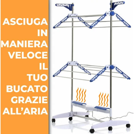 SPECIFICHE PRODOTTO:Marca: BakajiDimensioni: 85 x 65 x 145 cmLunghezza barre: 81 cm circaProfondità barre: 26 cm circaLunghezza cavo di alimentazione: 118 cm circaCapacità: 15 kg di biancheriaAlimentazione: AC 100-240 V 50/60Hz 24WColore: bluMateriale: acciaio, plasticaPulire solo con panno e acquaSalvaspazio e comodo da richiudereZero stress e zero sforzo fisicoUn’asciugatura continua grazie al sistema di ventilazione d’aria sul fondo