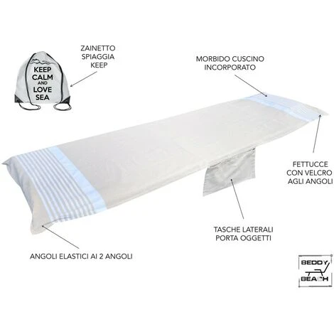 • Dotato di un morbido cuscino che è sistemato nel retro del telo tramite una tasca con velcro per un maggior comfort.