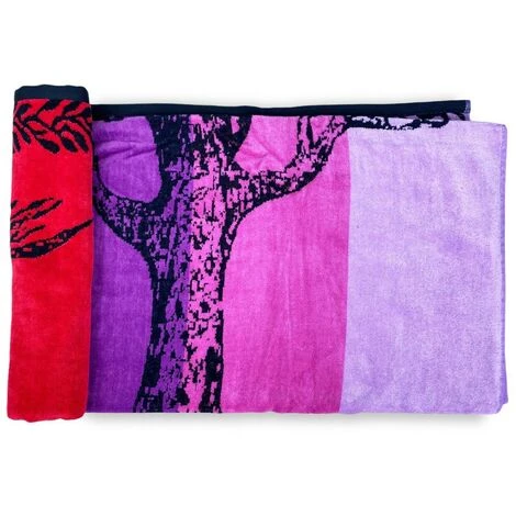 Questo telo ideale per il mare o per la piscina è in spugna di puro cotone, realizzato con il disegno dell’albero della vita sovrapposto a dei fascioni di colore rosso, viola e rosa.