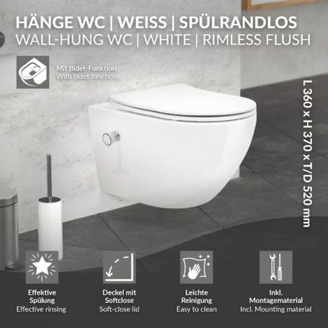 1 x WC sospeso senza bordo con funzione bidet, lungo, a parete