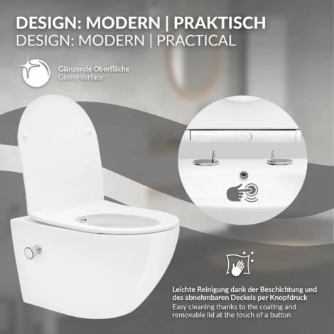 Con il loro design moderno, la toilette valorizza ogni bagno. Grazie alla sua forma senza tempo, può essere installato in qualsiasi bagno. Il sedile del WC e il coperchio sono stati progettati per essere particolarmente facili da pulire.La toilette con funzione di lavaggio senza bordo ha una superficie in ceramica particolarmente resistente e semplifica la pulizia e garantisce anni di utilizzo. Calce e contaminanti non si attaccano alla superficie antisporco. Per una maggiore igiene, una funzione bidet è integrata nella ceramica tramite un ugello. La posizione dell’ugello può essere regolata individualmente e quindi aumenta il tuo benessere personale. La durata e la quantità di acqua possono essere facilmente controllate utilizzando la valvola all’esterno.