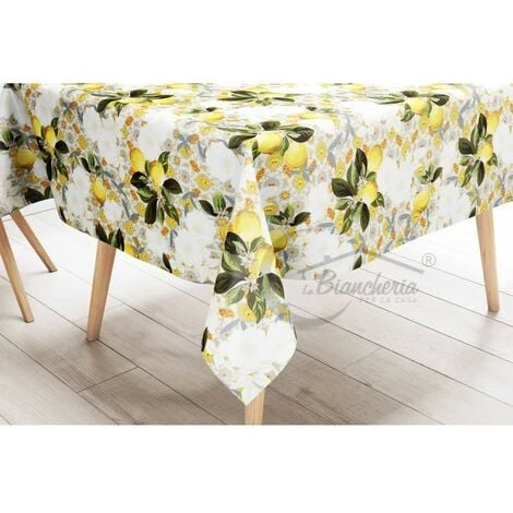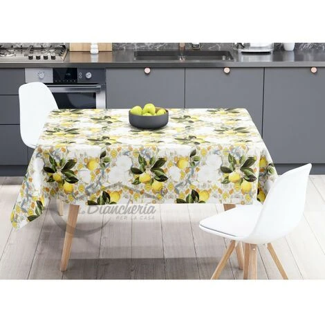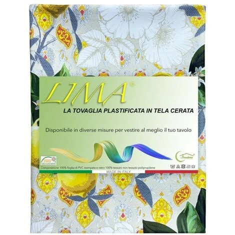 Tovaglia ‘ LIMA © ‘ in tela cerata morbida e ultra resistente stampata in un bel disegno stilizzato con limoni, semplice ed elegante.