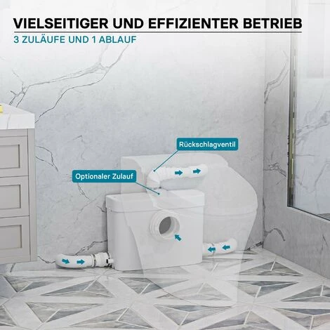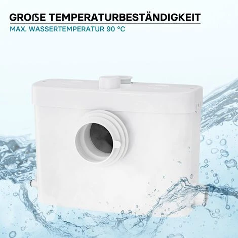 La pompa può quindi essere collegata allo scarico del WC e offre altri 2 raccordi per il collegamento a docce, vasche da bagno, lavabi, lavastoviglie, lavatrici o impianti simili. Gli ingressi inutilizzati possono essere facilmente sigillati utilizzando le chiusure incluse.