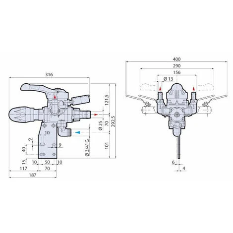 Unità di controllo con valvola di regolazione della pressione di lavoro, leva singola per la chiusura e lo scarico parziale o totale, manometro a bagno di glicerina con quadrante colorato.