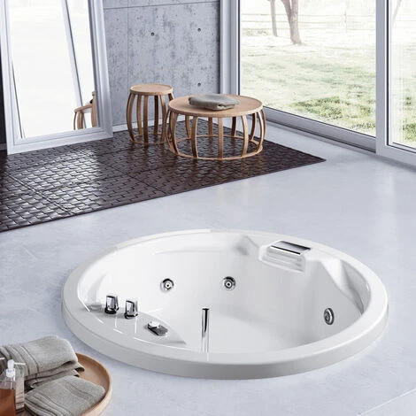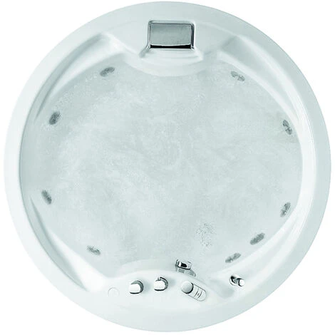 Vasca da incasso di diametro cm 150 realizzata in acrilico e Abs progettata per installazione a incasso nel pavimento con telaio. Con 8 getti whirpool per l’idromassaggio di rumorosità <=75dB ha alimentazione 220/240 V 50Hz e grado di protezione IPX5, completa di comando Easy Control.