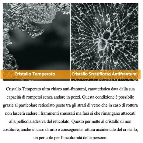 - 4. Vetro realizzato con una tecnologia avanzata che permette ai frammenti, in caso di rotture accidentali, di non cadere ma di rimanere attaccati tra di loro grazie alla particolare pellicola adesiva posta sul vetro in modo da ridurre al minimo il possibile rischio di ferite;