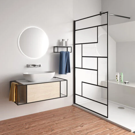 - 3. Walk In con riquadri in profili nero opaco che conferiscono uno stile industriale alla parete. Stile che può accostarsi bene ai bagni moderni ma risaltare anche con altri stili diventando un elemento di arredo a se stante;