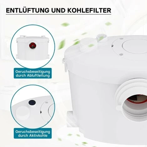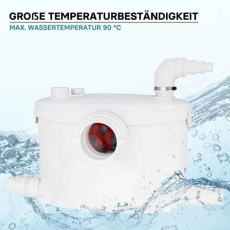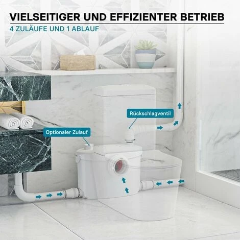 La pompa può quindi essere collegata allo scarico del WC e offre altri 3 raccordi per il collegamento a docce, vasche da bagno, lavabi, lavastoviglie, lavatrici o impianti simili. Gli ingressi inutilizzati possono essere facilmente sigillati utilizzando le chiusure incluse.